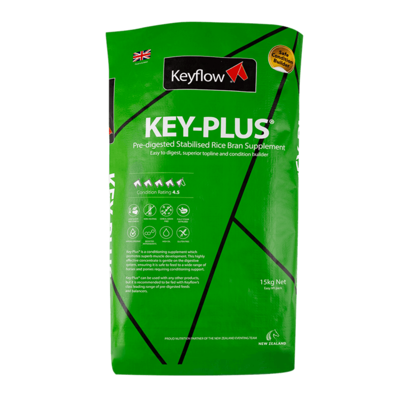 For horses requiring an increase in healthy body condition: 150-200g of Key-Plus™ per 100kg of bodyweight.