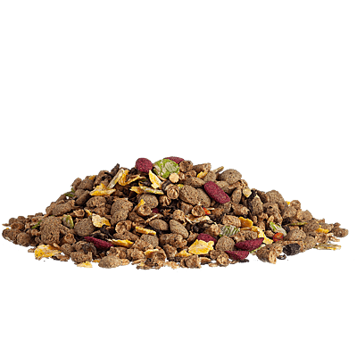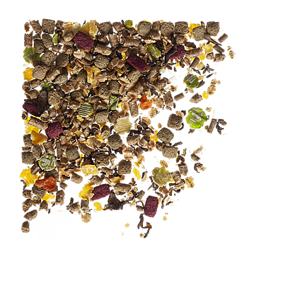 Contains micronised grains (including wheat, maize, peas, linseed), beetroot, steam extruded vegetable protein meals and stabilised rice bran, soya hulls, beet shreds, cold pressed rapeseed oil, carrot, vitamins and chelated minerals, biomos and protexin probiotics.