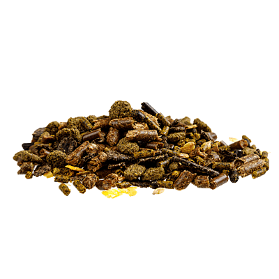 Contains fully steam extruded vegetable protein meals, soya hulls, oat-feed, beet shreds, hiprosoya, rapeseed meal, stabilised rice bran, micronised barley, alfalfa pellets, micronised linseed, micronised maize, full fat soya, cold-pressed rapeseed oil, salt, turmeric, prebiotics, heat stable vitamins and chelated minerals.