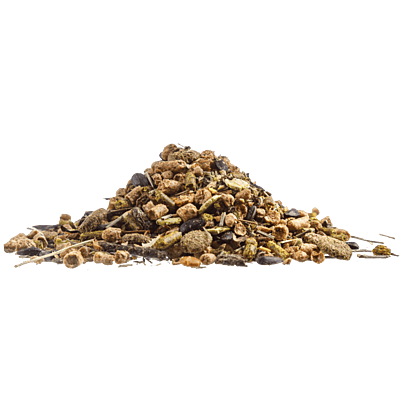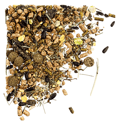 Steam extruded fibre, protein and omega 3 meals (including soya hulls, grass, stabilised rice bran, beet pulp, linseed, cold pressed rapeseed, full fat soya), micronised protein (including soya and pea), chopped grass, sunflower seeds, cold pressed rapeseed oil, heat stable vitamins and chelated minerals, prebiotics and probiotics.