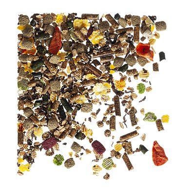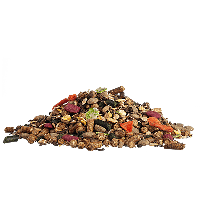 Contains micronised grains (including wheat, maize, soya flakes, peas, linseed), beetroot, steam extruded vegetable protein meals and stabilised rice bran, superfibres, beet shreds, carrot, cold pressed rapeseed oil, vitamins and chelated minerals, biomos & protexin probiotics.